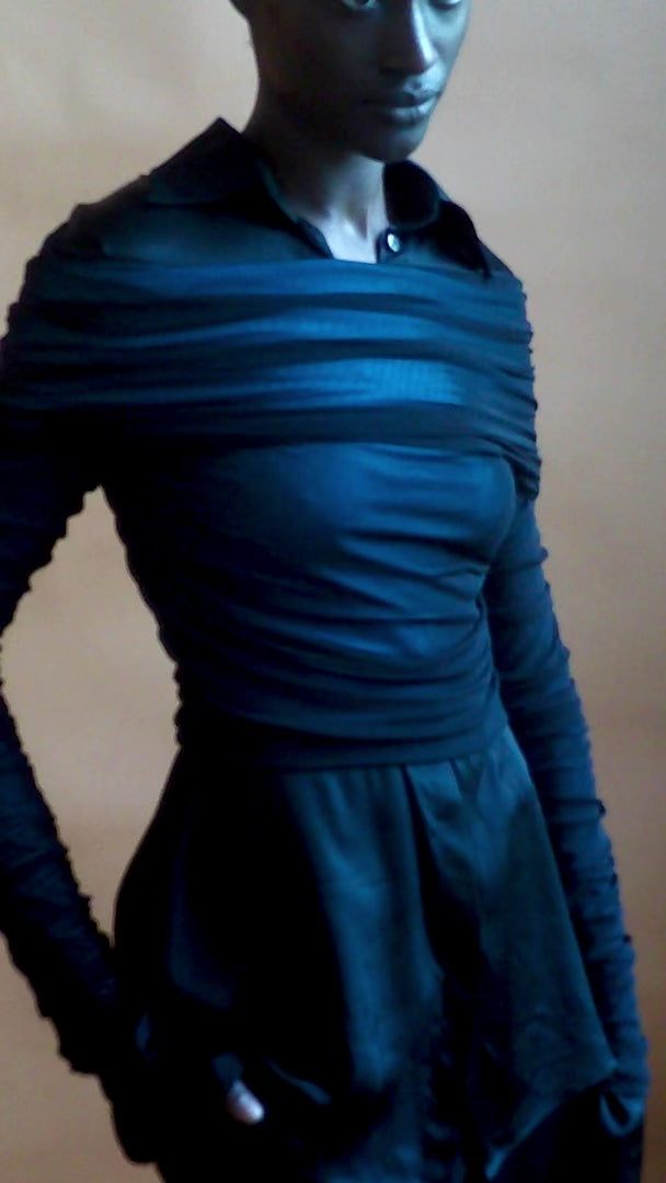 Crafted in blue jersey and gathered black mesh, featuring a Bardot neckline.