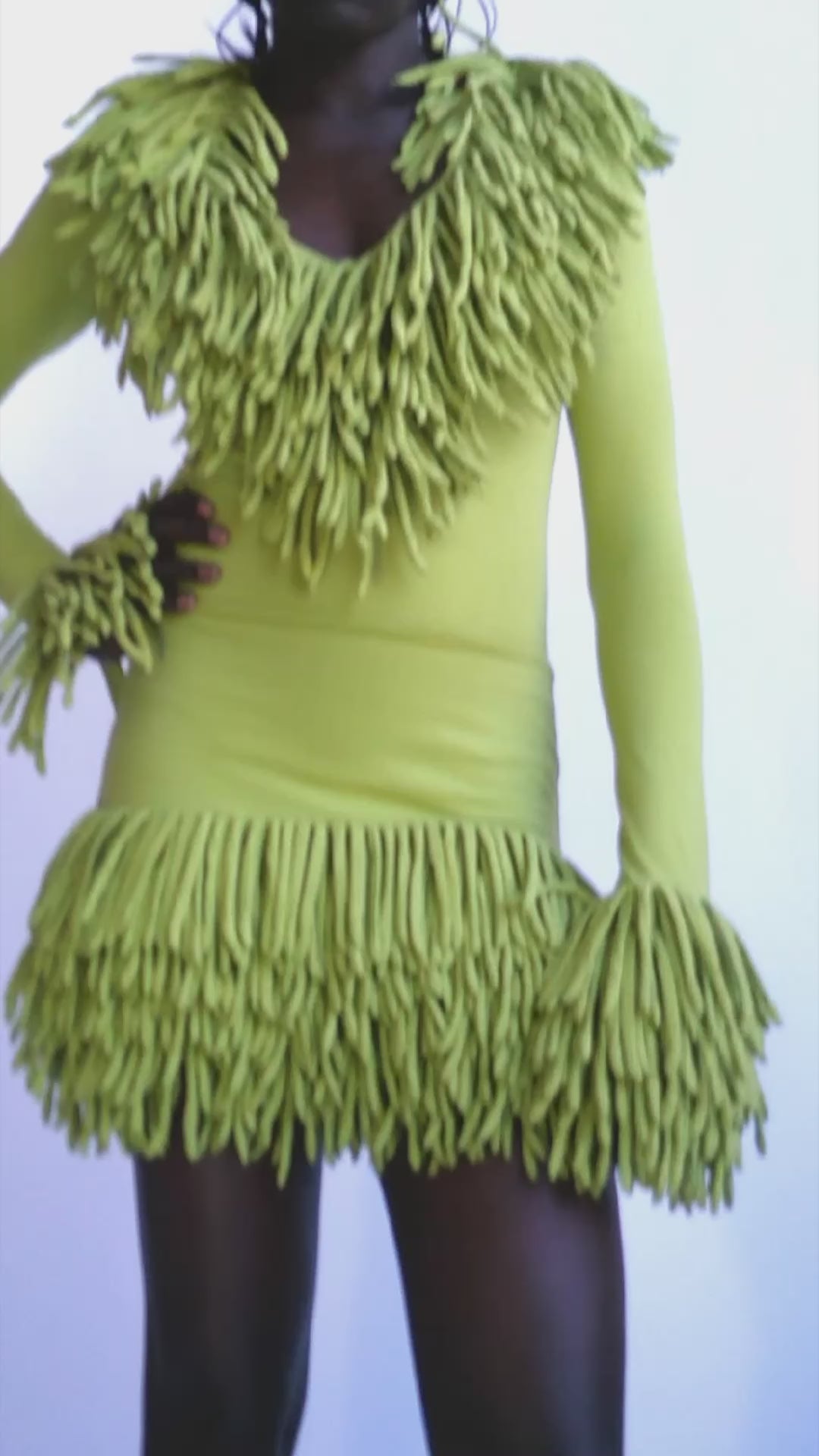 A mini skirt with a hand crafted in-house jersey fringe at the hem.